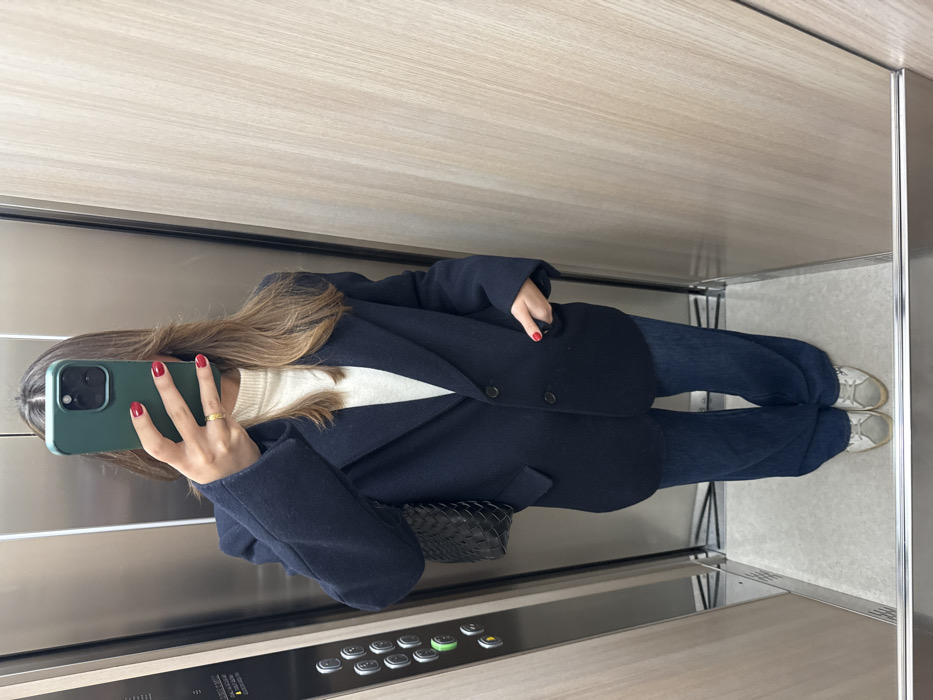 An individual is depicted taking a mirror selfie inside an elevator. The person, whose face is obscured by a dark green smartphone, wears a navy oversized blazer over a cream turtleneck sweater, dark blue wide-leg jeans, and grey and white athletic shoes. Red nail polish is visible on both hands, and a gold ring is on the left ring finger. A black woven leather bag is partially visible on the individual's left side. The elevator interior features light-colored wood-paneled walls and polished metallic panels, with a control panel on the left side displaying silver buttons and an illuminated green button. The floor is a grey patterned surface. No specific identifiers within the image pinpoint the exact location in Madrid, Spain.