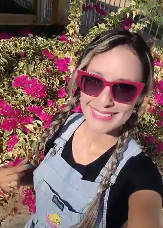 A young woman is taking a selfie outdoors. She has light brown hair with blonde highlights, styled in braids. She's wearing pink sunglasses, a black t-shirt, and denim overalls. The overalls feature a graphic of Tweety Bird. She is smiling at the camera. Behind her, there is a bush with bright pink flowers and green leaves. There's a white fence in the background, along with some green foliage and a hill or mountain in the distance. The sky is blue.
