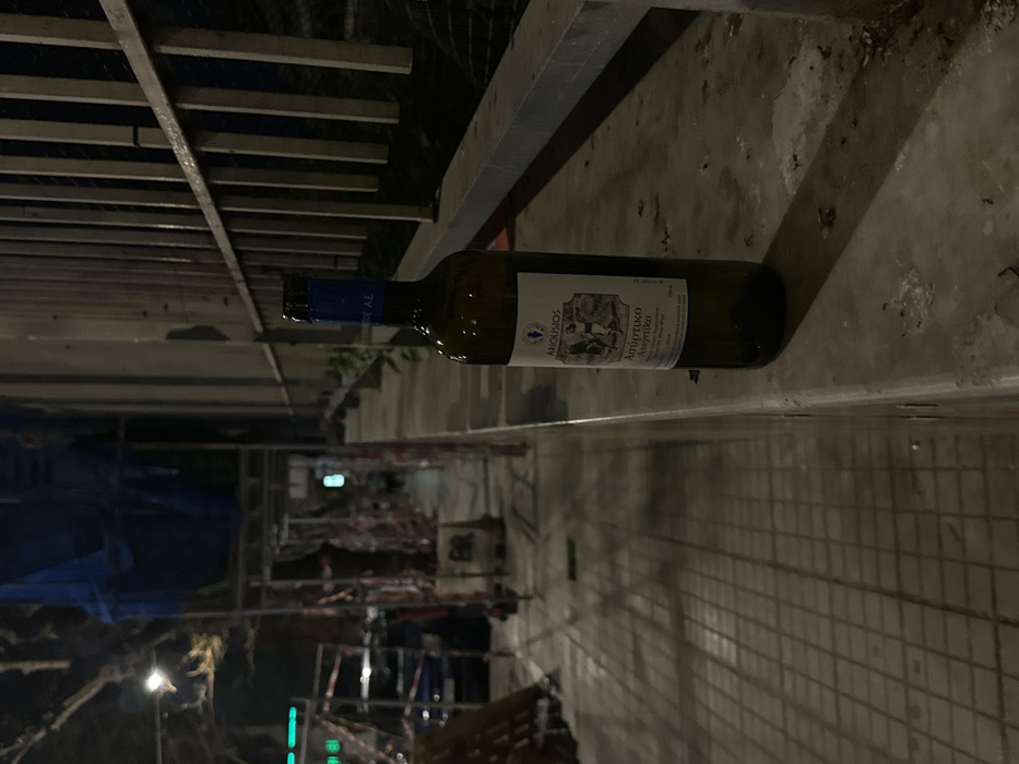 The image depicts an outdoor nocturnal urban scene in Athens, Greece. A nearly empty 750ml clear glass wine bottle, identified by its white label as "ARIOUSIOS Λαγόρτικο Ασύρτικο" (Dry White Wine), stands upright on a dirty, light-colored concrete ledge in the foreground. The bottle has a blue foil cap and contains a minimal residue of dark liquid. To the right of the bottle, a metal railing with vertical bars runs parallel to the ledge. To the left, a tiled sidewalk extends into the midground, partially illuminated by artificial light sources, casting prominent shadows. In the background, construction scaffolding draped with blue tarpaulins and marked with red and white caution tape is visible alongside a street with a partially discernible dark vehicle. Overhead streetlights are active. No individuals are present in the scene.