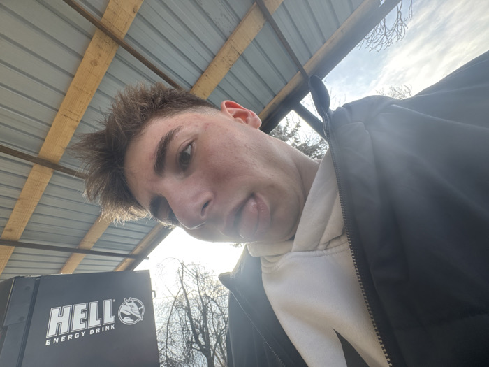 This image captures a young male individual from a low, upward-looking perspective in an outdoor or semi-outdoor setting in the city of Troyan, Bulgaria. The male, with light brown, spiky hair, light skin, and visible minor facial blemishes, looks directly at the camera with a neutral expression, his mouth slightly open and tongue subtly extended. He is dressed in a light-colored hooded sweatshirt beneath a dark, partially unzipped jacket. To the lower left, a black commercial refrigerator or cooler, emblazoned with the white "HELL ENERGY DRINK" logo and its devil mascot, is visible. Above the subject, a grey corrugated metal roof supported by wooden beams spans the upper portion of the frame. The background reveals a bright, partially cloudy sky and the silhouetted, bare branches of trees, indicating daylight conditions.