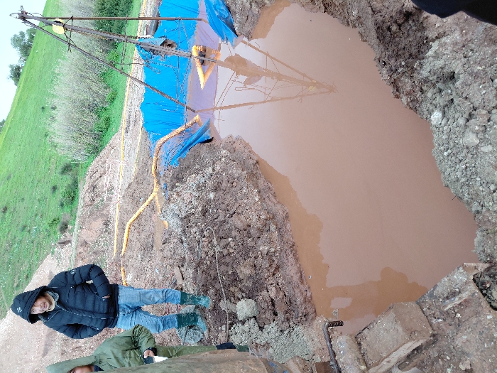 The scene depicts an outdoor, muddy environment in Sidi Moussa Ben Ali, Morocco, characterized by disturbed earth and standing reddish-brown water