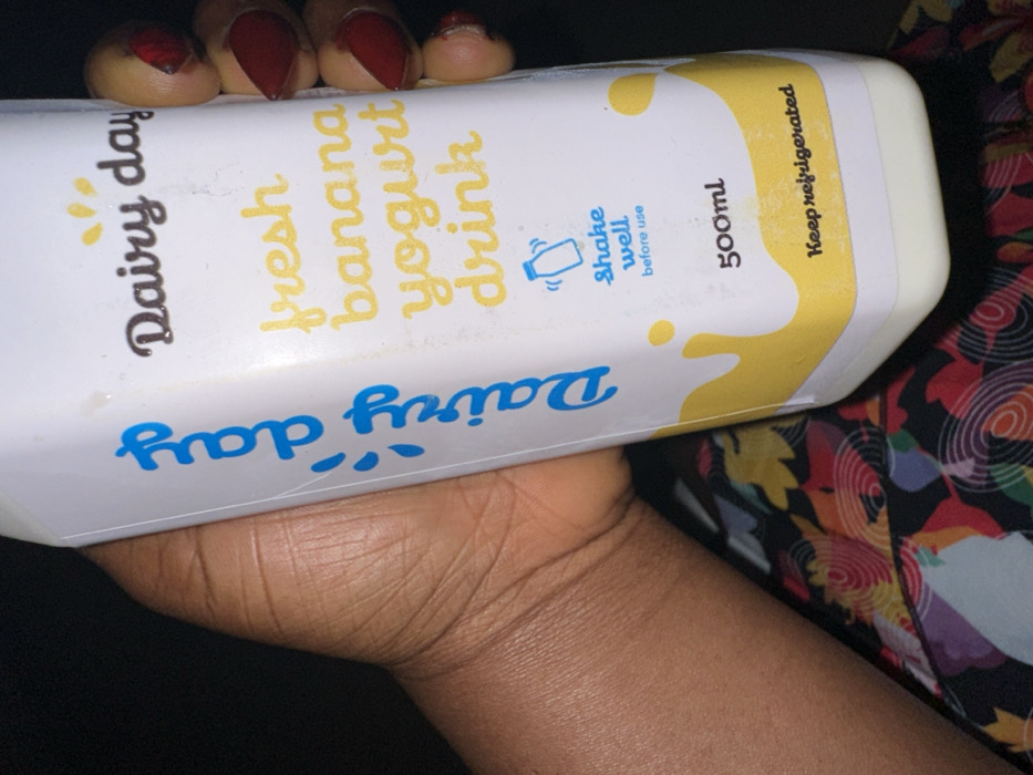 A hand holds a rectangular carton of "Dairy day fresh banana yogurt drink." The label displays "Dairy day" in brown and blue, followed by "fresh banana yogurt drink" in yellow. A small graphic suggests shaking well before use. The carton indicates a 500ml volume and advises to "Keep refrigerated." The hand features red-tipped nails and dark skin. A floral patterned garment is visible in the background.