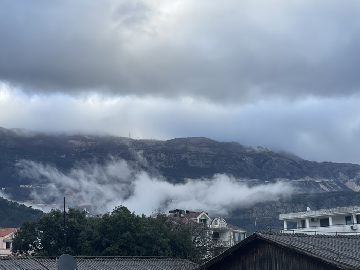 Gloomy landscape featuring a mountain range partly obscured by low-lying clouds or fog. The sky is overcast, with heavy gray clouds. Below, rooftops of buildings are visible, indicating a settled area. Some vegetation, possibly trees, are visible in the midground. The overall scene suggests a rainy or misty weather condition.