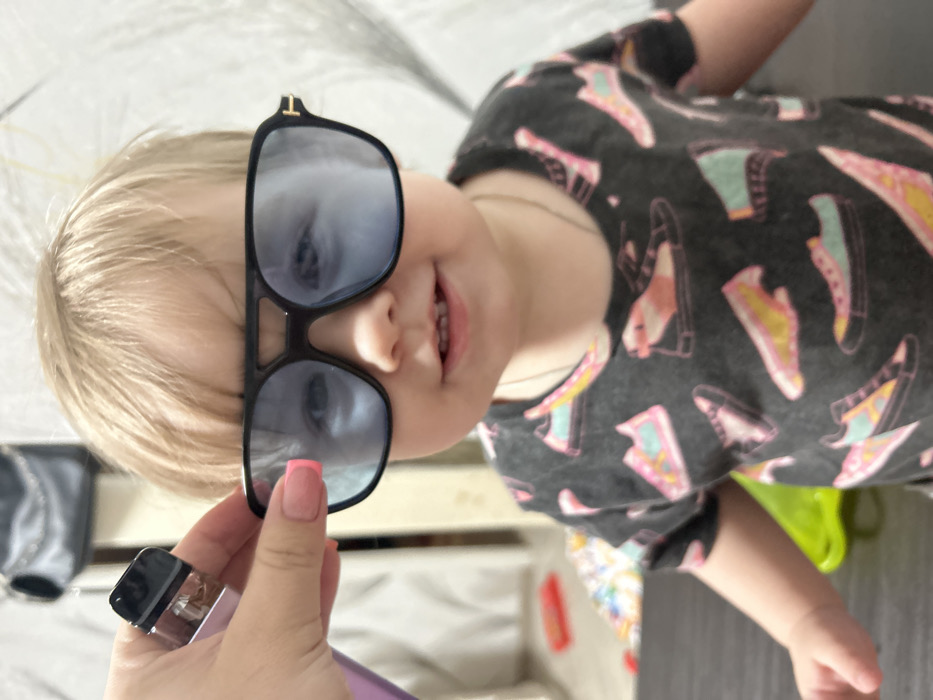 A close-up photograph depicts a young child, likely a toddler, in an indoor setting in Chaikovsky, Russia. The child, with fair skin and light-colored hair, is centered in the frame, wearing a dark grey t-shirt adorned with colorful sneaker patterns and a thin metallic chain. An adult's left hand, exhibiting pink ombre manicured nails, holds large black-framed, blue-tinted Tom Ford sunglasses to the child's face. The child is smiling faintly, with two lower teeth visible. Concurrently, the adult hand is holding a purple-bodied vaping device with a black mouthpiece and visible e-liquid. The background is out of focus, revealing a dark bag or purse in the upper left, a textured light-colored wall on the right, and a dark surface in the lower foreground on which a portion of a bright green plastic object is visible.