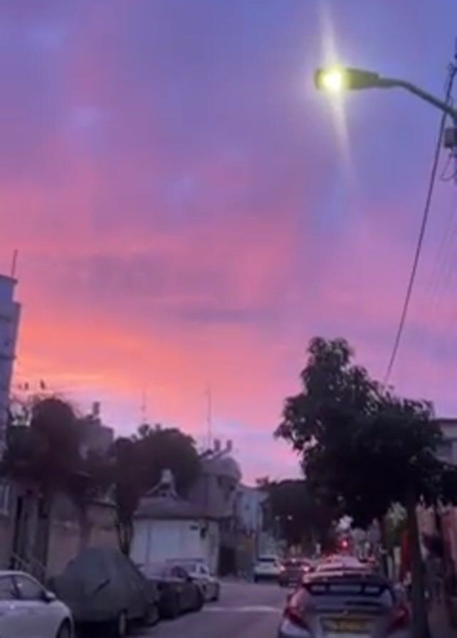 The camera is positioned on a street lined with parked cars, under a dramatic, colorful sky transitioning from orange near the horizon to pink and then to purple higher up