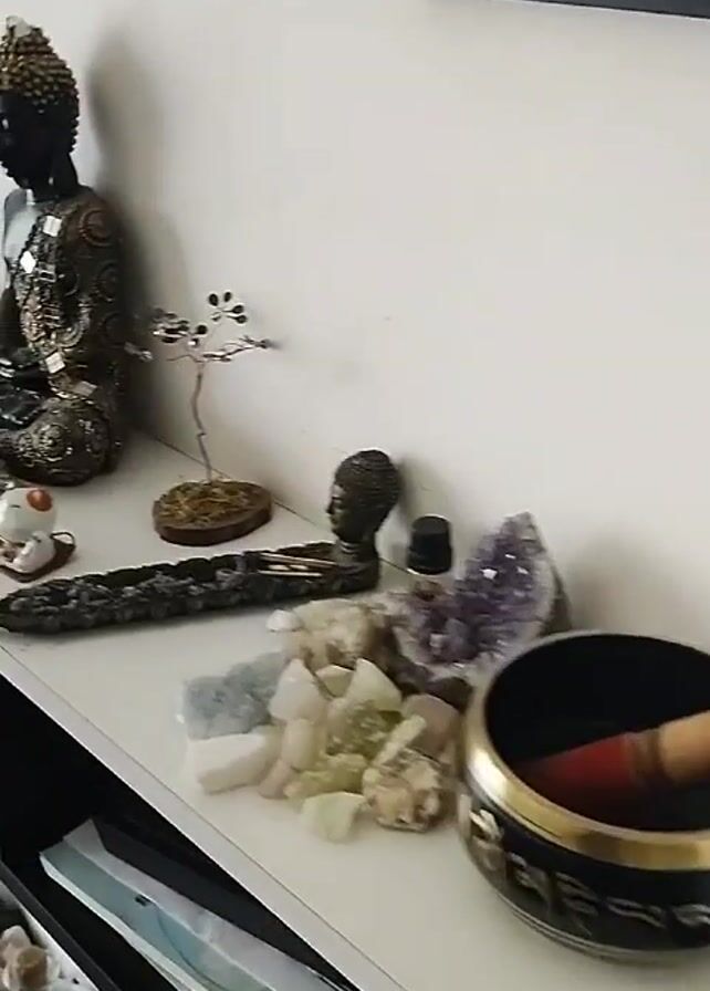 shelf with various objects, including Buddha statues, crystals, a singing bowl, and other spiritual items