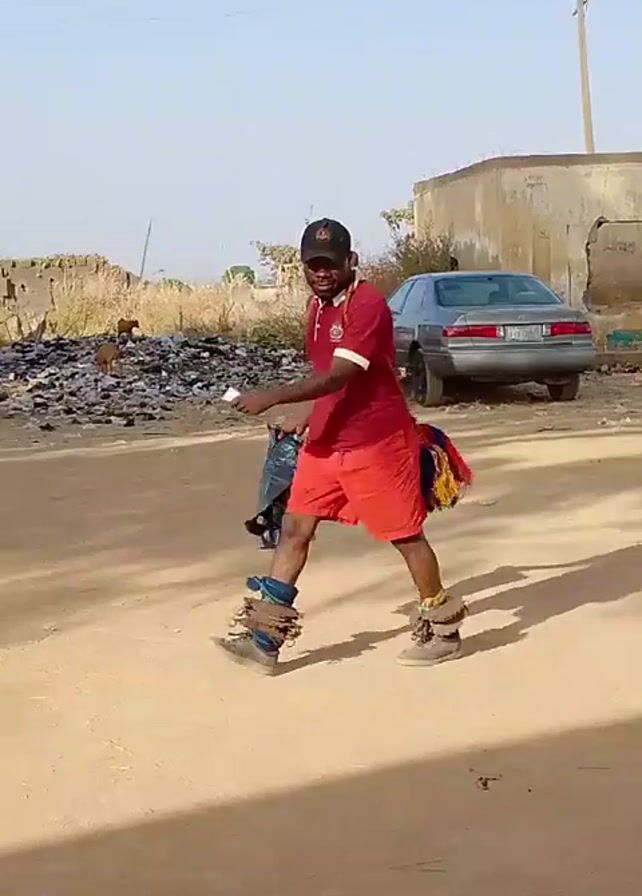 A man in a red polo shirt and red shorts is walking on a dirt road. He is wearing sneakers with metallic objects tied to his ankles. He carries a black plastic bag in one hand, and a colorful object that looks like a bunch of small hats in the other. He is wearing a black baseball cap. There are several cars parked nearby and buildings in the background. The sky is clear and the lighting indicates it is daytime. The road is mostly barren and dusty.