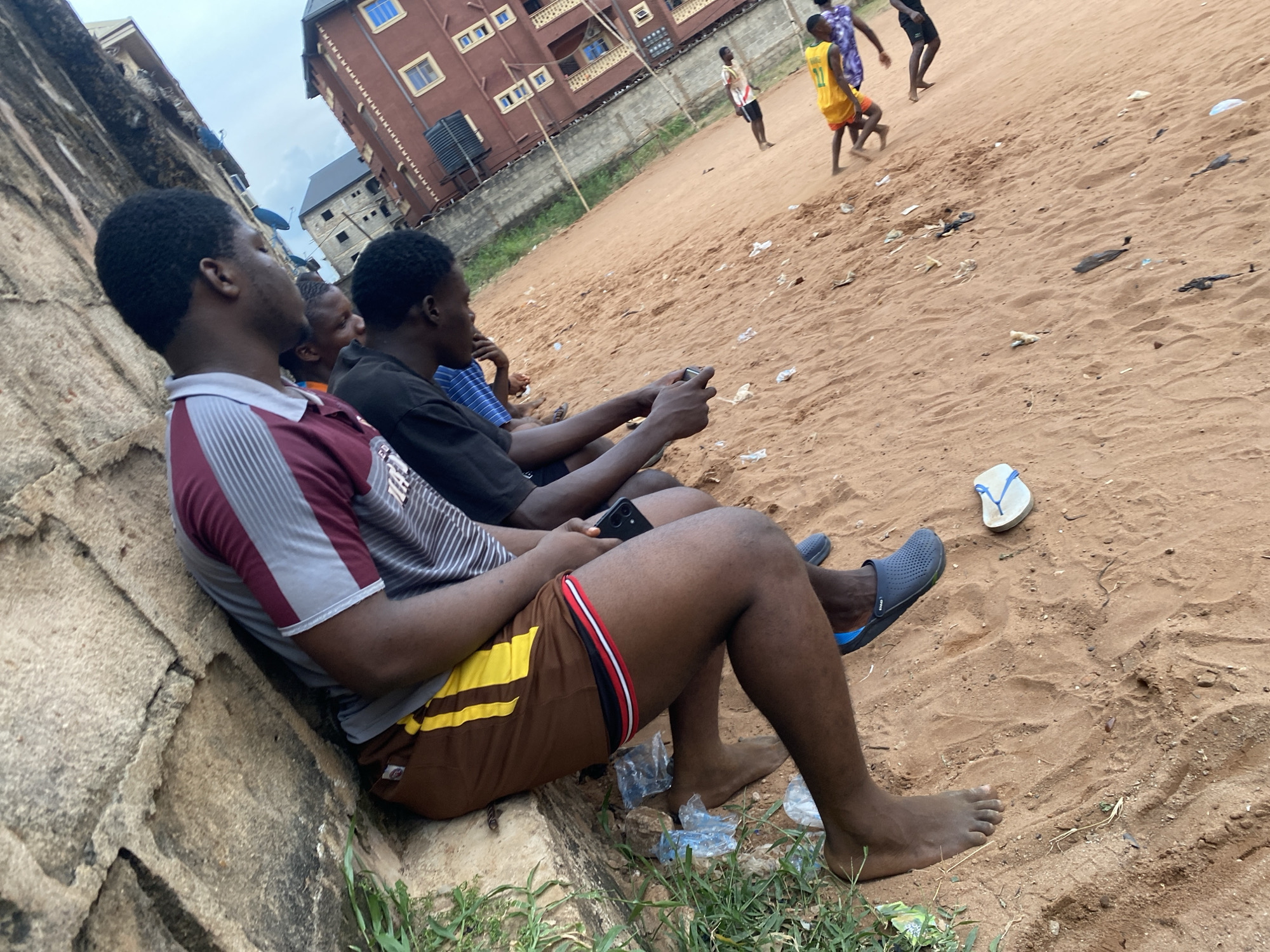 Three people are sitting against a rough, light gray, exterior wall in Onitsha, Nigeria. The person closest to the camera is wearing a gray and maroon striped shirt and brown shorts with yellow, red, and white stripes; he is barefoot. The person next to him is wearing a black shirt and is holding a black smartphone. Beyond them, the third person is wearing a blue and white striped shirt. They are all looking toward a sandy area where other people are playing some sort of game. Some of the game players are wearing jerseys. The sandy area is littered with trash. Behind the sandy area is a grassy strip, a concrete fence, and a brown multi-story building with tan accents and several windows. A dark blue sky with some white clouds is visible above the building. Next to the first person's bare foot is a blue clog. Nearby is a single white flip-flop.