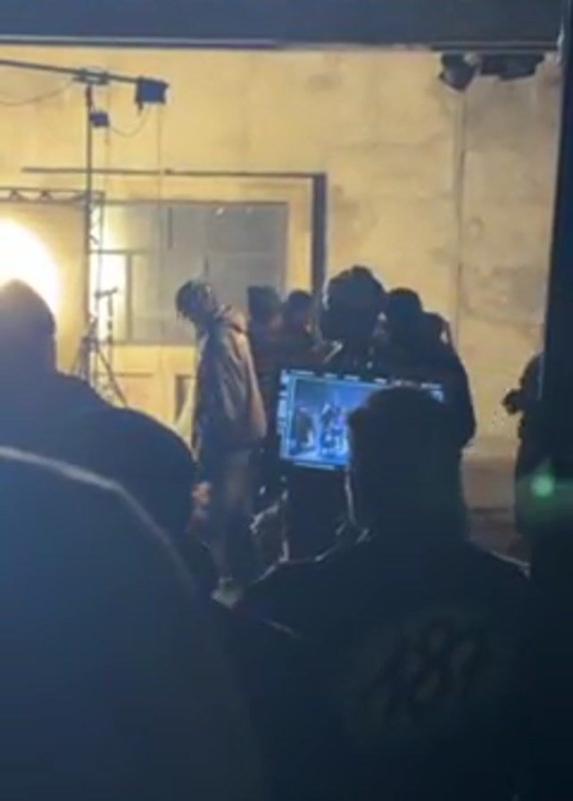film set inside a building with a high ceiling and visible brickwork. A group of people, mostly silhouetted, are gathered around a monitor, seemingly reviewing footage. Lighting equipment is visible, and individuals are walking around the set, possibly preparing for the next shot.