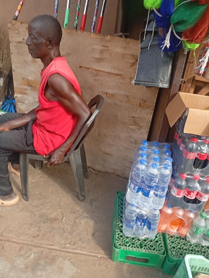 An elderly male is seated on a dark grey plastic chair within a roadside stall or small shop in Onitsha, Nigeria