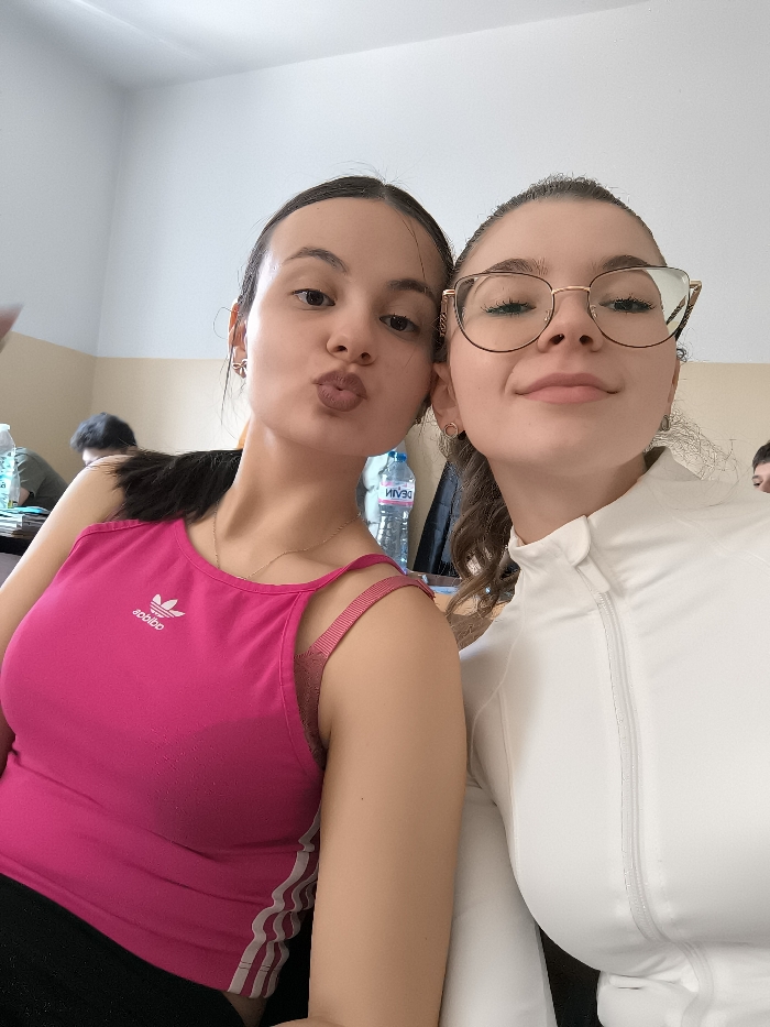 The image depicts two young women captured in a close-up, selfie-style photograph within an indoor setting resembling a classroom or educational facility. The specific location within the city of Pernik, Bulgaria, cannot be determined from the visual evidence provided in the image. The woman on the left has dark hair, dark eyes, and light skin. Her lips are pursed forward in a "kissy" expression. She wears a hot pink tank top featuring a white Adidas logo on the chest and three white stripes vertically along the side. A subtle gold chain necklace and small, silver-colored bow-shaped earrings are visible. The woman on the right has light brown, wavy hair and light skin. She is wearing gold-framed, cat-eye glasses and exhibits a slight smile with her eyes partially closed. She wears a white, long-sleeved athletic jacket with a visible zipper running down the front. A small gold hoop earring is visible in her left ear. Both individuals are positioned closely together, filling the majority of the frame. The background is blurred, showing a pale yellow wall meeting a white ceiling. Partially visible objects include what appears to be a desk or table surface, a clear plastic bottle of "DEVIN" branded water, and indistinct forms of other individuals and classroom-like materials such as notebooks or binders. The lighting is bright and even.