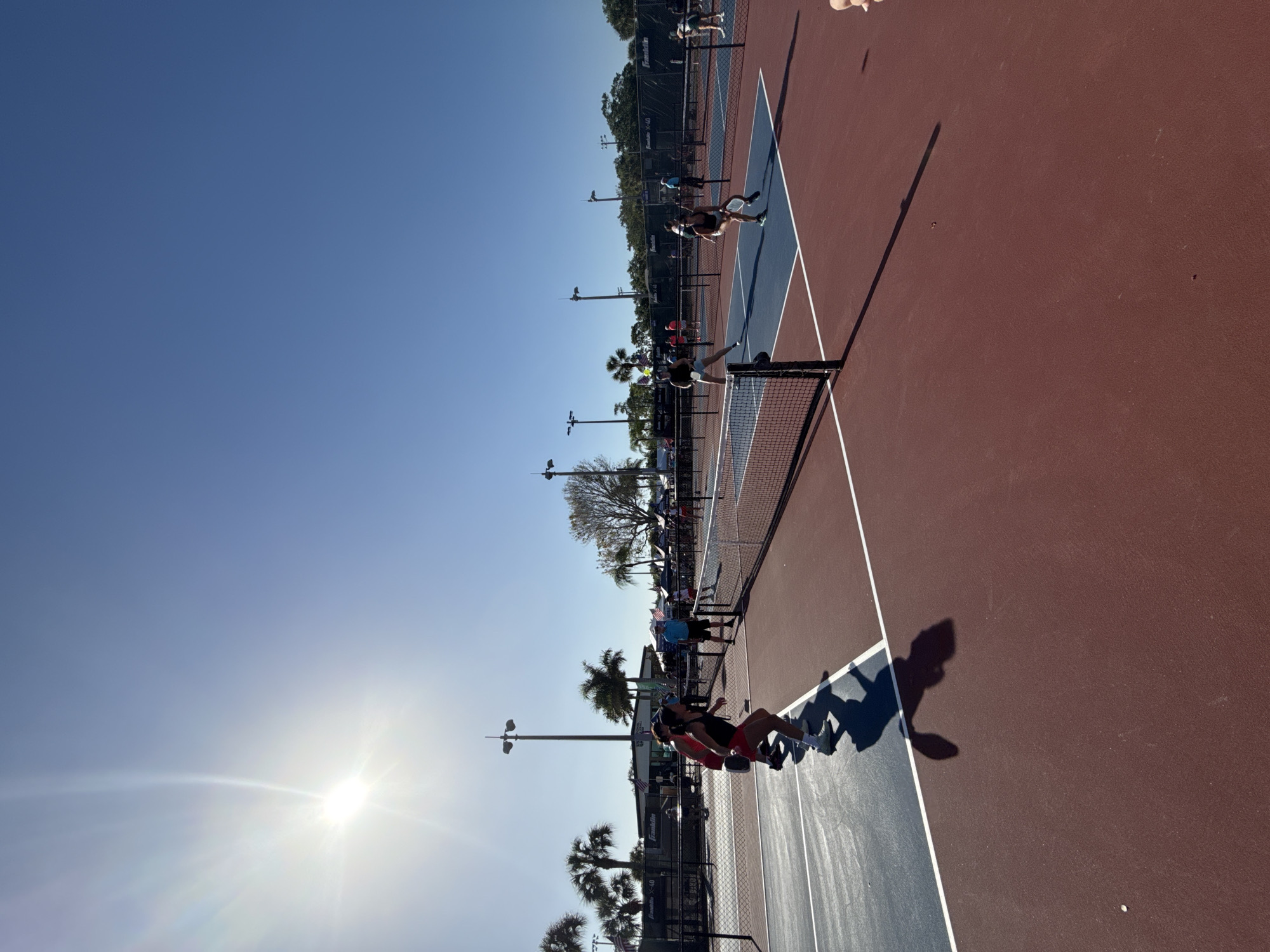 A sun-drenched outdoor pickleball court with a red and blue surface is shown. Several players are visible, in motion as they play. A net divides the court into two sides. Spectators and palm trees line the periphery of the court. The sky is clear and bright blue, with the sun's rays prominent in the lower left corner. Shadows of players stretch across the court.