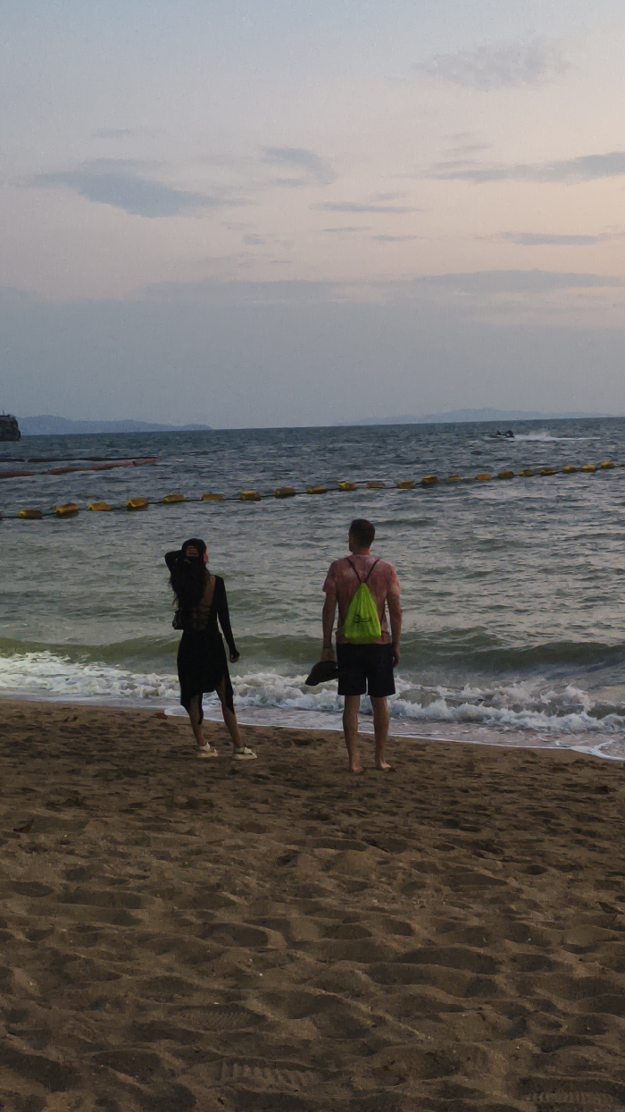 An image taken at dusk depicts a beach scene in Pattaya City, Thailand. The sky above is largely overcast with hues of light blue and faint pink, transitioning to a darker grey at the horizon. The ocean occupies the mid-ground, featuring gentle waves breaking on the sandy shore. A line of yellow buoys extends horizontally across the water, marking a boundary, with a distant small watercraft (possibly a jet ski) visible beyond them on the right. Distant landmasses or islands are faintly visible on the horizon. On the far left, a rocky outcrop or pier structure is partially visible. The foreground consists of a dark sand beach with numerous footprints. Two individuals stand on the beach, facing towards the ocean. The person on the left is a female with long dark hair, wearing a long-sleeved dark dress with a low-cut back and light-colored shoes. She is depicted with her left arm raised towards her head, appearing to adjust her hair or look back. The person on the right is a male, standing barefoot at the water's edge with small waves washing over his feet. He wears a light-colored, possibly tie-dye, t-shirt, dark shorts, and a neon green drawstring backpack. He holds a dark object, possibly footwear or a hat, in his left hand. There is no direct interaction between the two individuals visible in the frame; both are positioned to observe the ocean.