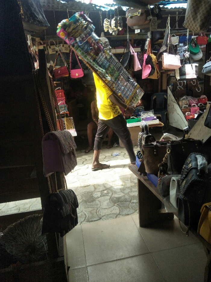 The scene depicts an indoor market stall in Satellite Town, Nigeria