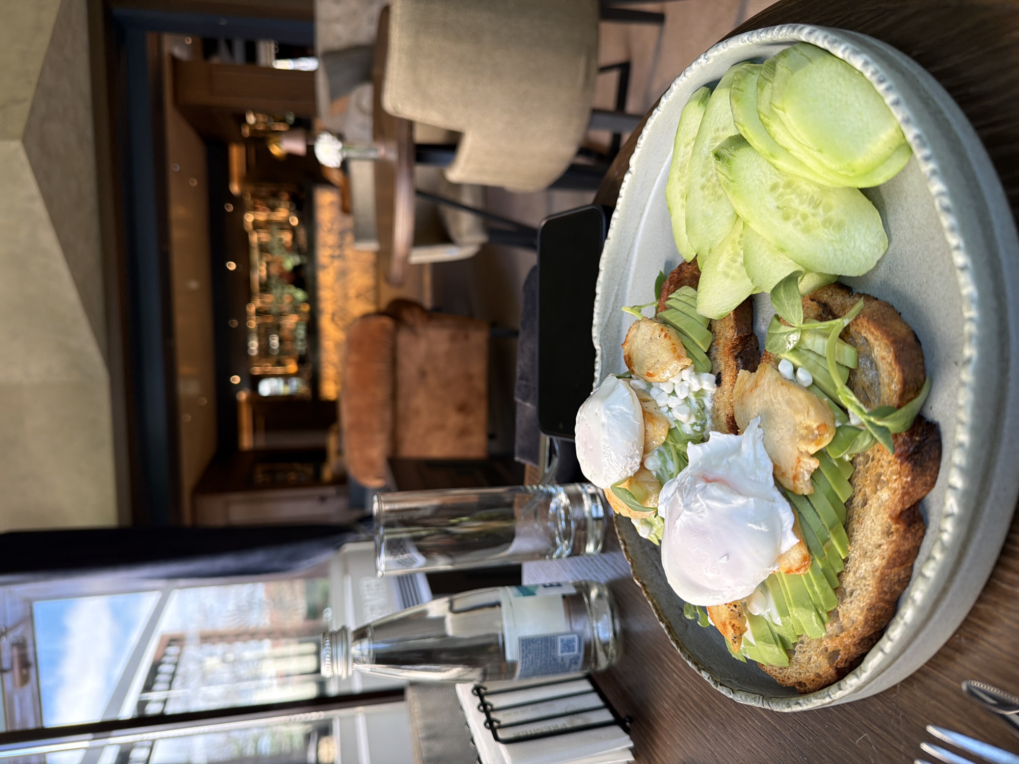 The image depicts a plate of food, possibly breakfast or brunch, consisting of toast, avocado, poached eggs, sliced cucumber, and other toppings, positioned on a wooden table. There is a glass of water and a bottle of water, along with a napkin holder, near the plate. The scene is captured indoors near a window with a view of the exterior, suggesting a cafe or restaurant setting. In the background, there are chairs, a bar area with illuminated bottles, and other patrons. Considering the prompt specifies Bansko, Bulgaria, the location is likely a dining establishment in that city.