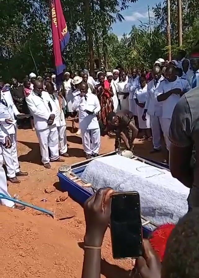 The video captures a somber burial scene. At the center is a blue coffin draped with a white cloth, attended by a man in a dark uniform who appears to be ceremonially tossing soil onto it with a small shovel. Surrounding the coffin is a crowd of people, predominantly dressed in white outfits. A few individuals wear suits, while others sport uniforms that suggest they might be nurses or members of a religious order. Most of the crowd stands respectfully with their heads bowed and hands clasped in prayer. A flag, burgundy with gold lettering, stands to the left. The ground surrounding the grave is reddish-brown. To the right in the foreground, a person is holding up a smartphone, seemingly recording the event. The backdrop is filled with tall trees, suggesting a natural or wooded environment. Overall, the scene is one of mourning and solemn farewell.