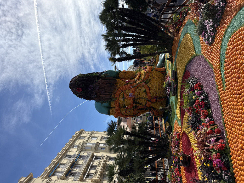 The image depicts a large, seated figure sculpture, viewed from the rear, situated outdoors in Menton, France. The sculpture's form is primarily composed of citrus fruits; its main body and lower limbs are covered in a mosaic of yellow and orange fruits, while the upper back and arm display a teal-colored surface. The figure's head is covered with dark, fibrous material resembling hair, adorned with several small red and purple flowers. The ground surrounding the sculpture is covered with an elaborate, curvilinear mosaic of uniformly arranged oranges, yellow citrus fruits, and green citrus, interspersed with beds of various green plants and flowering plants displaying red, pink, and purple blossoms. Clusters of slender palm trees are positioned to the immediate left and right of the sculpture. In the background, to the left, stands a multi-story, light-colored building featuring multiple balconies with blue awnings. Further in the mid-ground and background, numerous people are visible behind low barriers, observing the display. The sky above is clear blue with scattered white clouds and features two distinct aircraft contrails: one linear, stretching diagonally across the upper left, and another broader, horizontal contrail in the upper right. The scene is illuminated by direct sunlight.