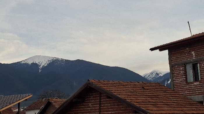 The image depicts an exterior scene in Bansko, Bulgaria, characterized by architectural structures in the foreground and natural mountain landscapes in the background, under an overcast sky. In the foreground and midground, several building rooftops are visible. To the left, a section of a dark-tiled roof with an exposed light-colored wooden beam overhang is present. Centrally, a prominent terracotta-tiled gabled roof is seen, constructed from brown-red tiles, with a dark brown or black trim along its ridge and eaves. Below this, other indistinct rooftops and bare tree branches are partially visible. To the right, a multi-story building constructed with exposed red bricks and a matching terracotta-tiled roof is observed. This building appears either unfinished or un-rendered. A rectangular window opening, possibly with a dark frame, is visible on its right facade. A thin, dark rod-like object extends vertically from the highest point of this building's roof, possibly an antenna or lightning rod. The background is dominated by a range of mountains. A large, dark forested mountain chain stretches across the image. Its upper slopes and peaks are covered in snow. A distinct, snow-capped peak is visible in the left-center, featuring a clear, inverted V-shaped snow pattern descending from its summit. Further to the right, behind the brick building, another sharp, snow-covered mountain peak is discernible. The sky above is uniformly light grey, indicating overcast conditions with diffuse cloud cover. No people or visible actions are present in the scene.