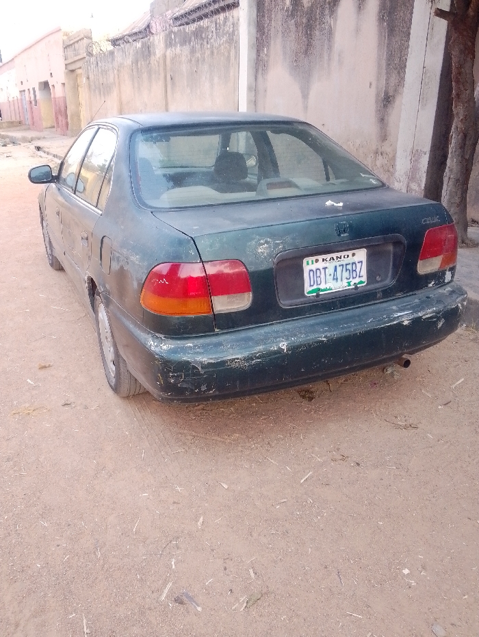 A dark green Honda Civic sits on a sandy, unpaved road. The car has a Kano license plate reading DBT-475BZ. Visible damage to the rear bumper suggests wear and tear. Behind the car is a tall, weathered concrete wall with a barbed wire fence on top. A tree trunk appears on the right side of the frame, close to the wall. In the distance, buildings line the opposite side of the street.