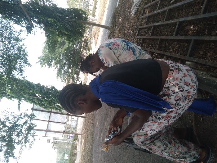 The image depicts an outdoor scene in Osu, Nigeria, featuring two individuals seated on a low ledge under bright daylight. In the foreground, a person with cornrows, wearing a black short-sleeved top, white trousers with a floral pattern, and a blue fabric draped over their left shoulder, holds a smartphone in their left hand and a small, wrapped item in their right, looking downwards. Adjacent and slightly behind them, a second individual, seen from the back, wears a light-colored floral patterned top and also has braided hair, looking downwards. The ground beneath the individuals is covered with dry leaves and dirt. To the right of the seated figures, a metal grid structure lies on the ground. The background features several tall trees, including slender evergreens, and distant urban structures such as a large billboard frame and buildings, visible through the foliage.
