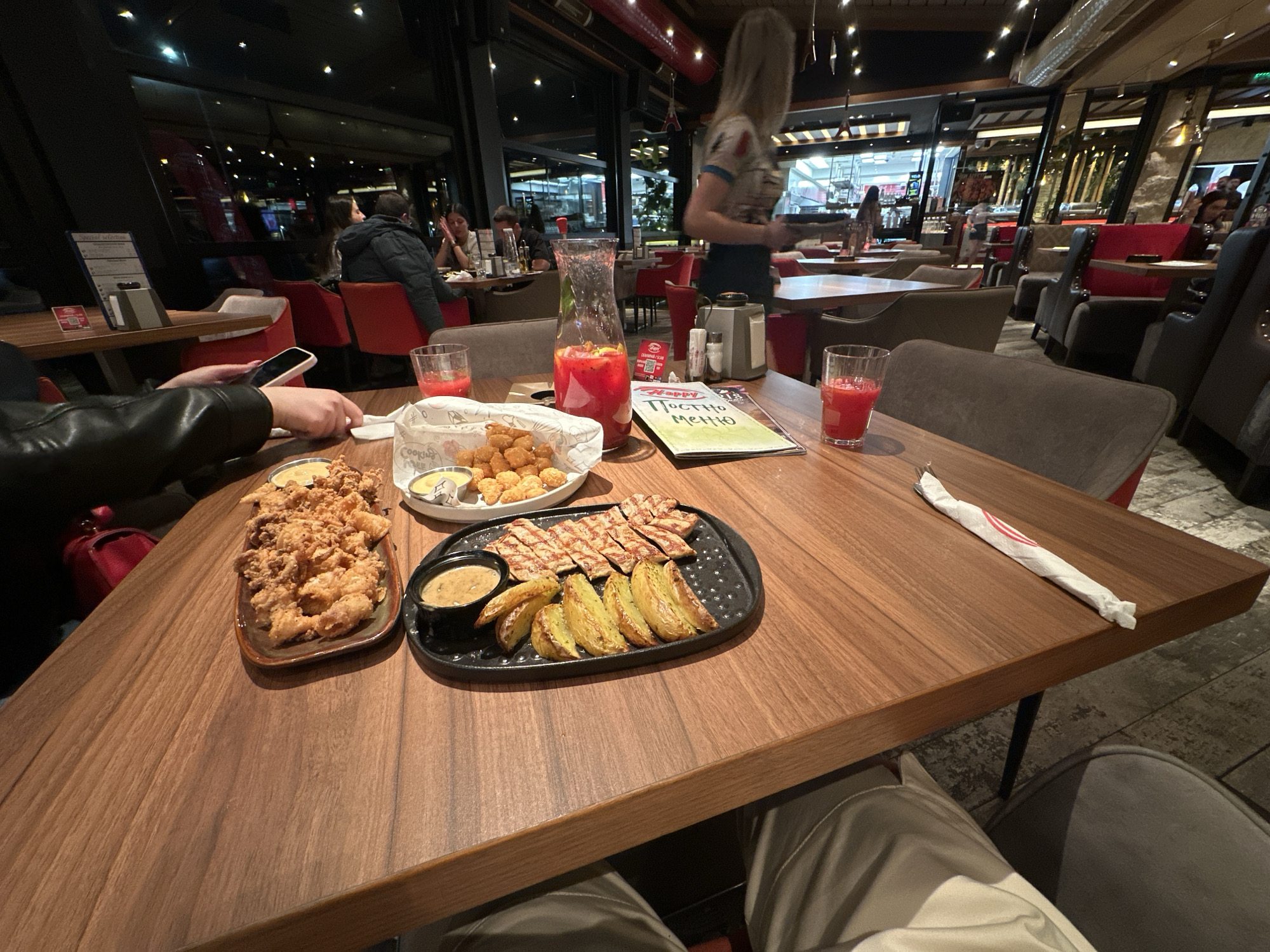 The image depicts the interior of a "Happy Bar & Grill" restaurant at night, located in Sandanski, Bulgaria. The perspective is from a diner's seat at a wooden rectangular table, looking towards the opposite side of the establishment and out through large glass windows. In the immediate foreground, a variety of food and drinks are laid out on the table. A white paper-lined basket contains numerous golden-brown fried spherical food items, with a small cup of dipping sauce. Adjacent to it, a rectangular ceramic dish holds a substantial serving of deep-fried, irregularly shaped items, possibly calamari, accompanied by another small dipping sauce cup. A black, textured serving plate presents grilled, sliced meat with distinct grill marks, alongside several potato wedges and a small bowl of sauce. Beverages include a tall glass pitcher filled with a red liquid containing fruit pieces, and two individual glasses of the same red drink. A green folded menu titled "Happy Постно Меню" (Happy Lenten Menu) is on the table, next to a salt and pepper shaker set. A rolled white napkin with a red stripe is visible on the right edge. To the left, a person's hands wearing a black leather-like jacket are visible, holding a white smartphone over the table. The lower legs of another person, wearing light-colored trousers, are visible beneath the table on the right, indicating the viewpoint of the person taking the photo. In the midground, other diners occupy tables with upholstered chairs, some red and some grey/brown. A blonde-haired female server, wearing a light-colored top, walks past these tables, carrying an unseen item. Further into the restaurant, additional tables and chairs are visible, with warm interior lighting. The background features large glass windows reflecting interior lights and showcasing the blurred, illuminated streetscape or pedestrian area outside at night, indicating an urban setting. Design elements such as a textured stone wall section and various modern light fixtures are visible within the restaurant's interior.