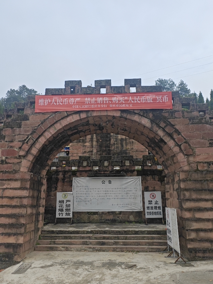 An external view depicts a large, weathered reddish-brown stone archway, possibly part of a historical city gate or wall, located in Bishan, China, under an overcast sky. The archway features a double-layered design and is topped by a crenellated parapet. A red banner spans the wall above the arch, displaying Chinese characters that translate to "Maintain the dignity of RMB. Prohibit the sale and purchase of 'RMB-version' ghost money," with "People's Bank of China Chongqing Branch, Chongqing Civil Affairs Bureau" indicated below. At the base of the wall, within the arch opening, a large white banner titled "公告" (Notice) presents detailed Chinese text. To its left, a smaller white sign states "严禁烟花爆竹燃放" (Strictly prohibit fireworks and firecrackers). To the right, another white sign with a "no smoking" symbol declares "禁止燃放鞭炮 焚烧香烛纸钱" (Prohibit setting off firecrackers, burning incense and ghost money). A partially obscured white A-frame sign stands further right. Stone steps lead up through the archway. A single individual in a blue top is partially visible through the archway, appearing to be descending stairs on the opposite side. The ground in the foreground is paved. Trees are visible above and beyond the stone structure, with faint power lines crossing the light gray sky.