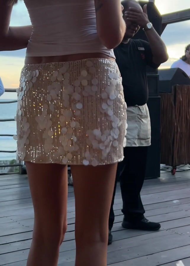 woman from the waist down, wearing a white top and a short, shiny, off-white skirt with a round, disc-like pattern. She is standing on a wooden deck. Other people are nearby, including a person in a black uniform. In the background is a railing, the ocean, and the sky at dusk. The woman is moving slightly as if dancing or swaying to music.