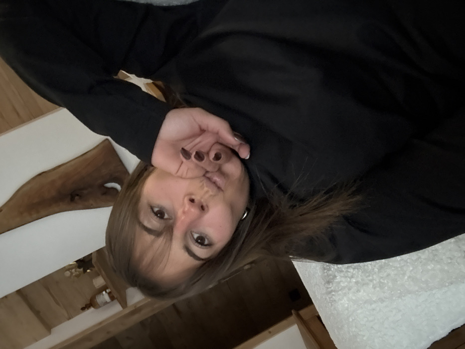 A woman in a black shirt lies sideways. Her right hand is near her pursed lips. She has brown hair with bangs. A wooden shelf with a live edge board is behind her. Bottles sit on the shelf. The bed with a textured white blanket is on the right. The camera is tilted.