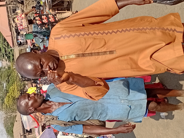 Two men are the focus of the image, which is likely taken in a bustling outdoor market. The man in the foreground wears a light blue shirt. The other man, positioned partially behind, is dressed in an orange, patterned tunic. They appear to be engaged in conversation. The busy market setting is filled with merchandise and people, lending a sense of activity to the scene. Overhead power lines and leafy trees are barely visible in the distance.