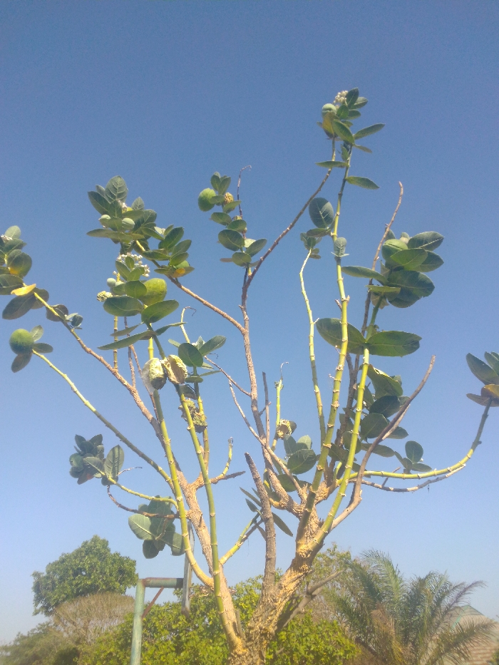 The scene depicts an outdoor environment in Saminaka, Nigeria, under a clear, bright blue sky. The primary subject is a large plant, likely Calotropis procera, occupying the majority of the frame from the bottom, extending upwards. This plant features thick, segmented stems ranging in color from light green to yellowish-brown. Numerous large, ovate, dull green leaves are visible, some with lighter undersides. Multiple green, ovate seed pods are present on the branches; several are visibly ruptured, exposing white, fibrous material. Small clusters of white flowers are also discernible among the leaves on some upper branches. In the lower background, other green trees and foliage are visible, including a palm tree-like specimen on the right and a partially obscured metallic structure, possibly a support or frame, on the lower left. No human figures or animals are present. The lighting suggests bright, natural daylight.