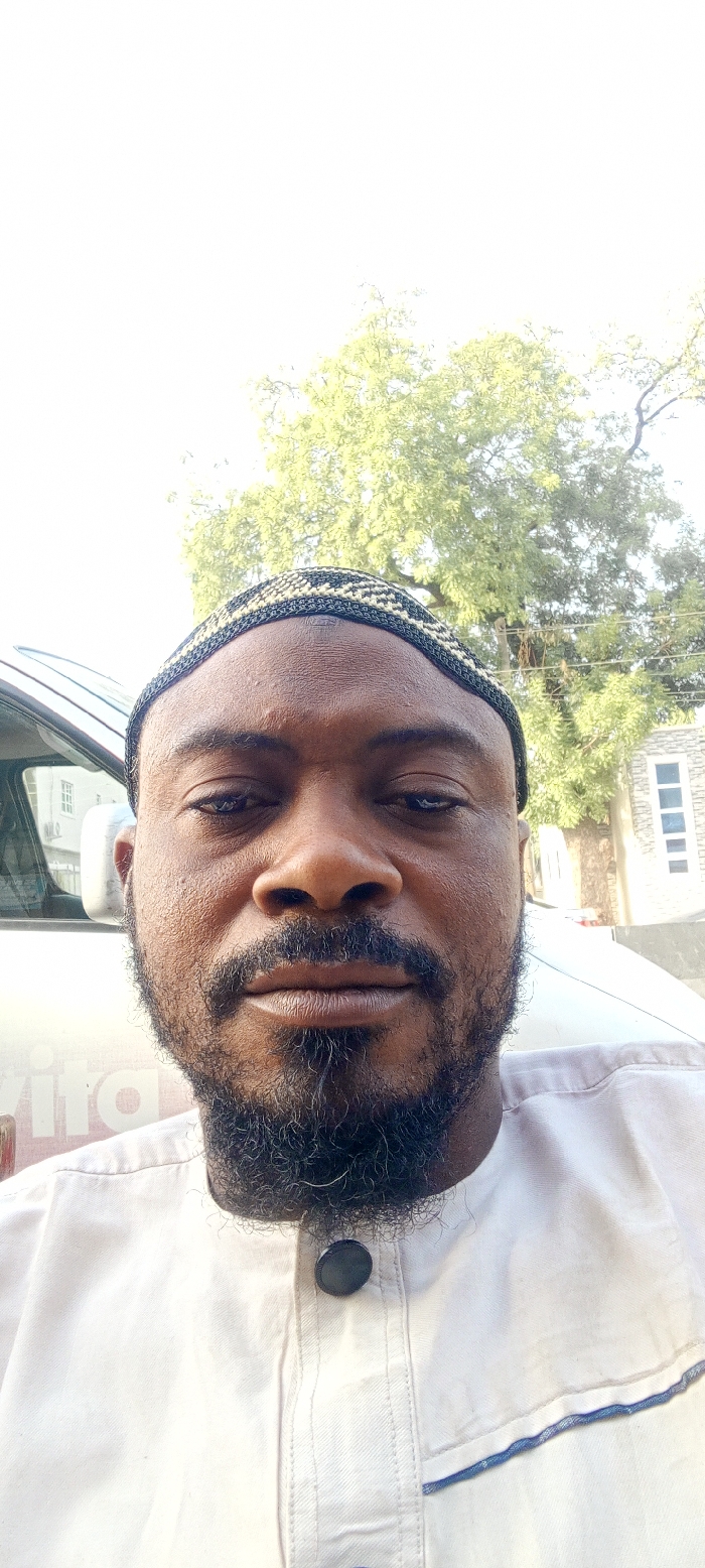 A man wearing a cap and light-colored clothing poses for a selfie outdoors. He has a beard and mustache, with a serious expression. In the background, there's a vehicle with writing on it and a large tree with sparse leaves. A building with windows is also visible behind the tree. The lighting is bright, indicating daytime.