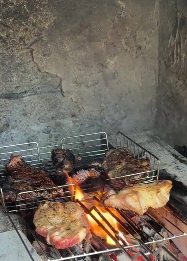 - "Several cuts of meat are arranged on a metal grill over burning coals inside what appears to be a stone fireplace" by FM-wxaN63, licensed under CC BY 4.0