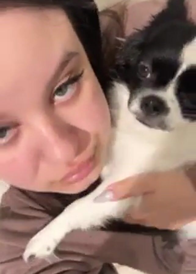 young woman holding a small, black and white dog in her arms. The woman has long, dark hair and is wearing a light brown sweatshirt. She is looking at the camera with a somewhat serious expression. The dog is looking off to the side. The woman then kisses the dog on the head. The background appears to be a simple, domestic setting.