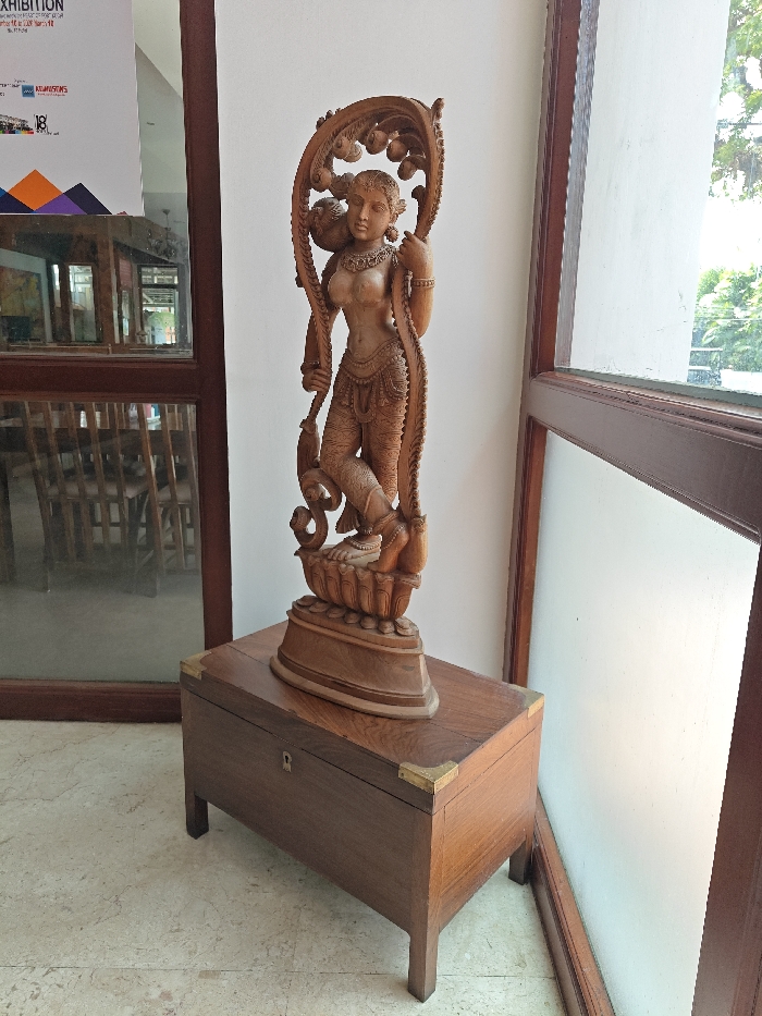 An ornately carved wooden statue of a female figure stands on a polished wooden chest, positioned indoors at the Kerala Folklore Museum in Kochi, India