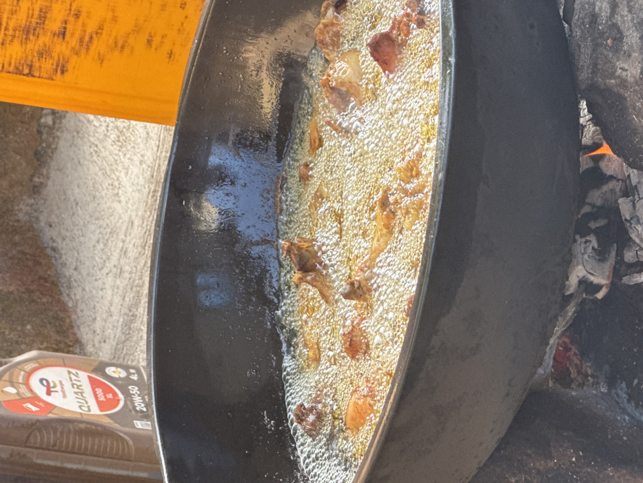 A large, black cauldron sits atop a pile of glowing coals and ashes. The cauldron is filled with bubbling oil and pieces of fried food, likely meat. The scene is partially outdoors, with a wooden surface to the left and a concrete surface in the bottom left corner. A bottle of oil, labeled "Quartz 5000" and "20W-50," is partially visible near the concrete surface.