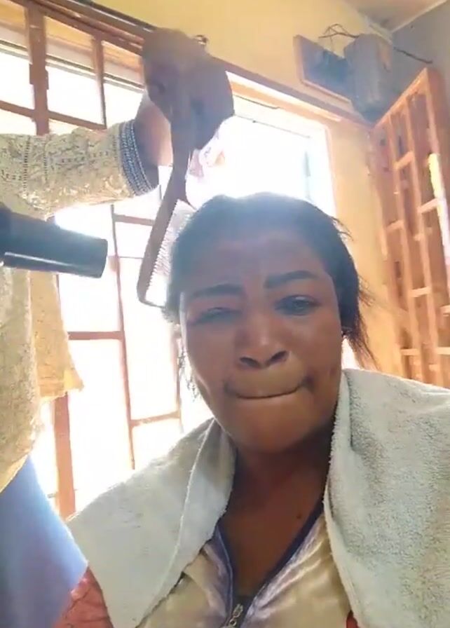A woman is getting her hair dried with a black hair dryer by a person out of frame. The woman is sitting in front of a window with a white towel around her shoulders. She is wearing a patterned shirt with a zipper. The background shows various items, including hair products and a wooden cabinet. The room appears to be a hair salon or personal care space. The woman is looking directly at the camera with a slight smile.
