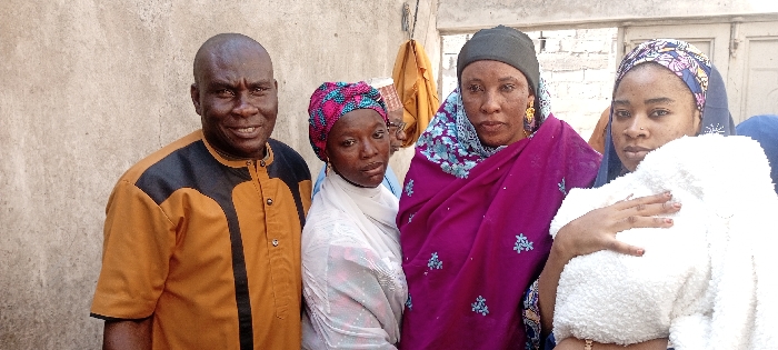 The image displays four individuals standing outdoors in the city of Dan Maliki, Nigeria, positioned against a plain, light-colored wall