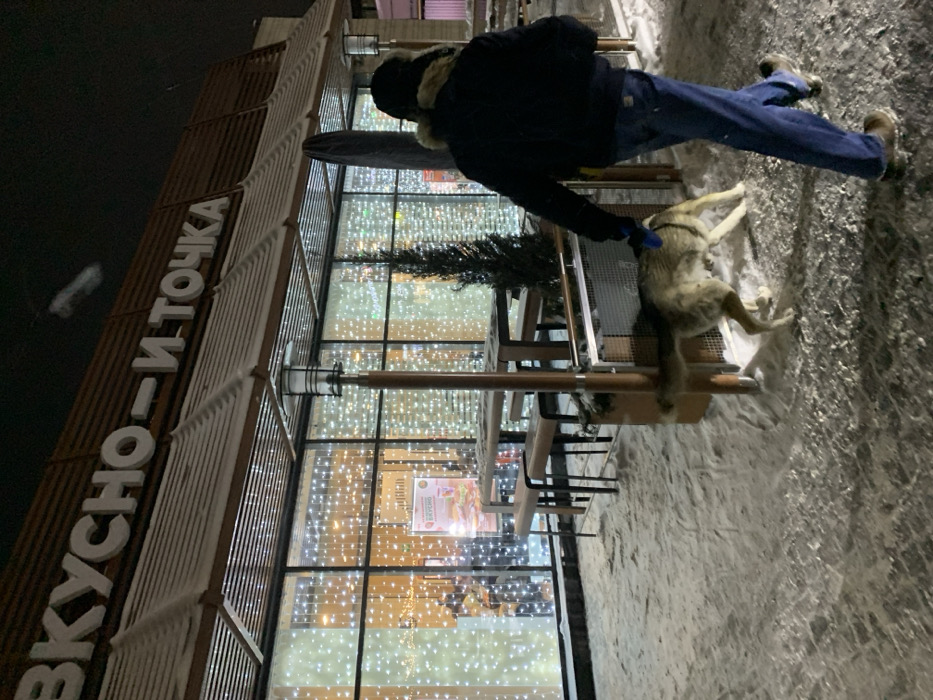 A person in a dark jacket, blue jeans, and tan boots is petting a dog. The dog is light brown and white and laying on its side in the snow. They are outside of a building with many lit windows. The building is decorated with a small Christmas tree. The name of the building "Вкусно - и точка" is on the side of the building.