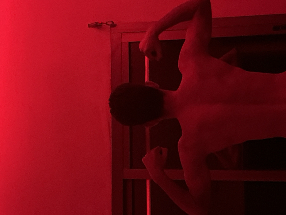 A person is photographed from the back, posing with flexed biceps in an indoor environment within Sarouja Municipality, Syria. The individual has short, dark hair and a bare torso. The scene is bathed in pervasive red lighting. Directly behind the subject is a dark-colored frame, possibly for a door or window, featuring vertical structural elements. On the red-illuminated wall to the upper right of the frame, a small metallic fixture, consistent with a hook or latch, is observable. The subject's arms are bent at the elbows, with clenched fists raised to shoulder height, showcasing muscle contraction.