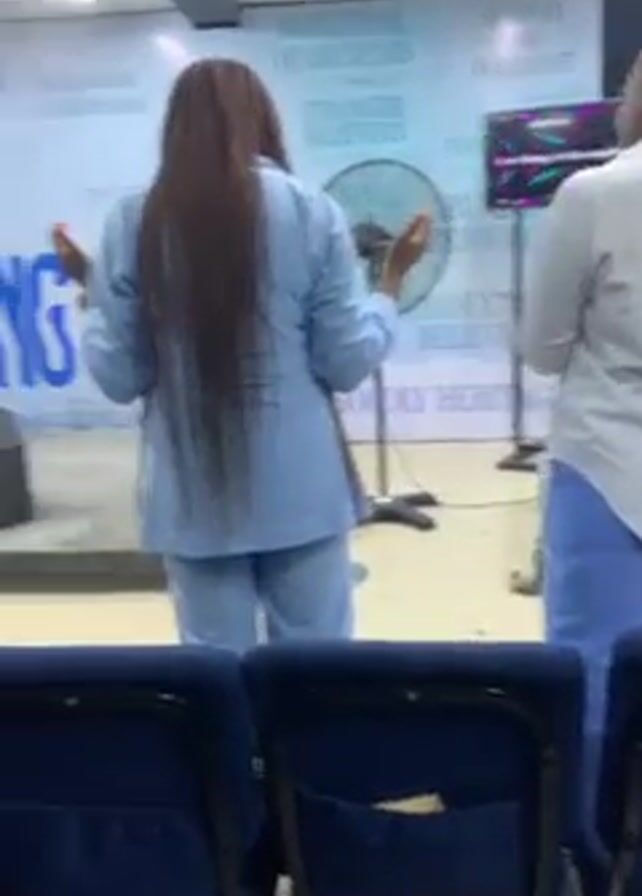 group of people in what appears to be a church or meeting hall. Two women are standing at the front, possibly leading the group in song or prayer, as a projection screen displays text behind them. Other individuals are seated in rows of blue chairs, some standing and looking towards the front. The people are wearing a variety of casual outfits. A support pole is visible between the rows of chairs and the front.
