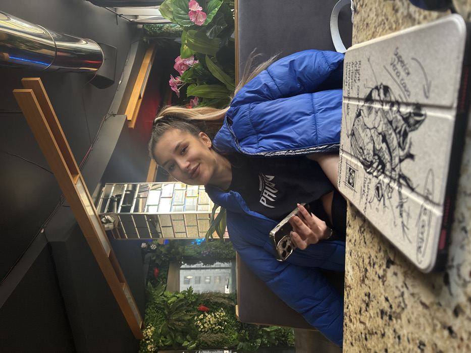 The scene depicts an interior of a cafe or restaurant located in Sofia, Bulgaria. A female subject is centrally seated at a speckled granite-patterned table, wearing a blue puffer jacket over a black t-shirt with a white graphic. Her long, light-brown hair is pulled into a high ponytail. She holds a smartphone with a reflective case in her left hand and smiles directly at the camera. In the immediate foreground on the table, a light-colored tablet case, featuring a detailed black-and-white anatomical drawing of a human heart and labels including 'Pulmonary', rests. The background includes a dark ceiling with prominent wooden light fixtures and a metallic ventilation duct. A vertical column adorned with square mirrored tiles is positioned behind the subject. A wall to the left is covered in artificial green foliage with scattered red and white floral accents, while to the right, pink flowering plants are visible. A window on the far left offers an obscured view of an exterior building.