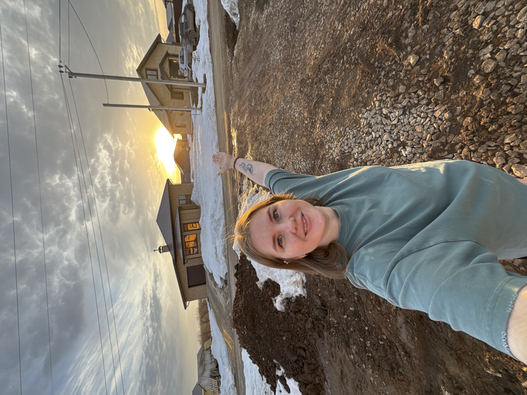 A selfie taken by a woman in Gornyi (Dvurechenskoe S/P), Russia. She is standing on a dirt and gravel path with remnants of snow. Behind her are two brick houses. A utility pole is to the left of the house furthest in the background. The sun is setting, creating a bright glow in the sky. The woman is pointing towards the houses with her right arm. A vehicle is parked in front of the background house. The sky is filled with wispy clouds.