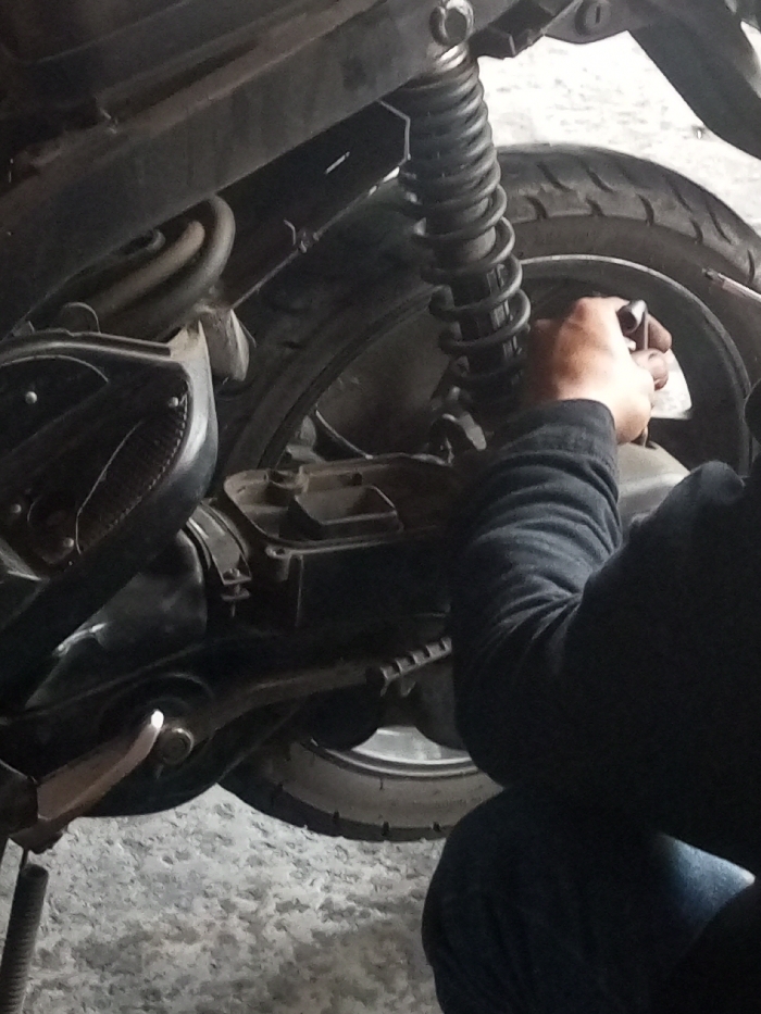 A person in dark clothing repairs the rear wheel area of a black motorcycle. The motorcycle's rear tire is visible, along with its suspension. A portion of the frame, engine casing, and associated parts are also visible. The person is using a tool near the tire, indicating maintenance or repair work. The floor appears to be a concrete surface.