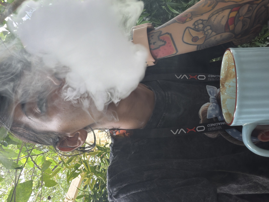 A person exhales a large cloud of white vapor, obscuring part of their face. They have dark hair and fair skin, with visible tattoos on their arm. A light blue mug with dark liquid is visible on the right. The individual wears a dark shirt with a lanyard that reads "VAXOO". Green foliage is present in the background. The image is taken at an angle.
