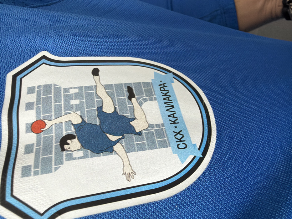 The image presents a detailed close-up of a shield-shaped logo affixed to a vibrant blue, textured fabric, likely a sports jersey or uniform. The logo features a white field bordered by concentric black, white, and light blue stripes. Within the shield, a stylized light blue stone tower with crenellated battlements forms the background. In front of the tower, a male figure is depicted in mid-air, caught in a dynamic, leaping pose. He wears a dark blue short-sleeved top and shorts, with pale skin, and holds a red handball in his raised right hand, suggesting an throwing action. His left arm is extended backward, and his legs are bent and spread, indicating motion. Below the central illustration, a light blue ribbon banner displays the Cyrillic text "СКХ · КАЛИАКРА ·" in black capital letters. This text translates to "SKh · Kaliakra ·", directly linking the emblem to Kaliakra, a geographical area near Kavarna, Bulgaria. The blue fabric background exhibits a fine, uniform weave characteristic of athletic apparel. No other elements of the surrounding environment are visible.