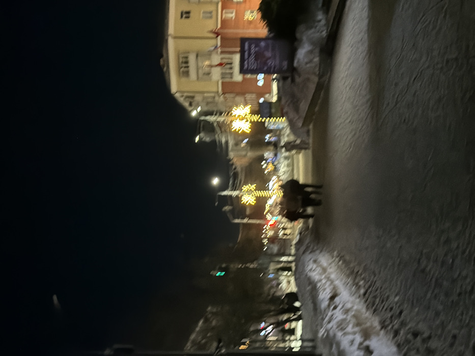 A night scene shows a snow-covered street. Lights, some shaped like stars, illuminate the path. A building stands to the left, partially obscured by the darkness. Two figures walk along the sidewalk, their forms indistinct. Snow piles up on the right edge of the street. A sign and a building are visible beyond the figures. The overall atmosphere is dim, with the lights offering a focal point.