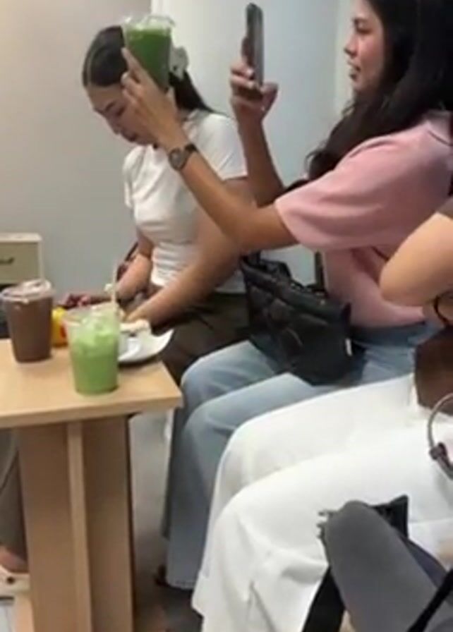 Four women are seated at a table in an indoor space. The table is light brown and holds drinks and a plate of food. One woman wears a white t-shirt and has her hair pulled back. She looks down at the table. Another woman, wearing a pink top and jeans, holds her phone up, seemingly taking a photo or video of the drink. The third woman, in a brown top, is partially visible on the right side of the frame. The fourth woman sits on the right in a white skirt. The environment is plain, with a light-colored wall behind the women and a Marshall speaker visible in the background.