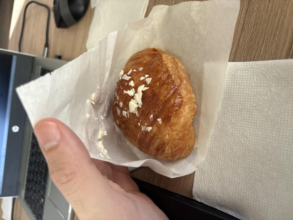 The scene is located in Зеленогорское сельское поселение, Ukraine, and depicts an indoor, close-up view of a light wood-grain desk surface. A light-skinned human left hand holds a white paper bag or wrapper, which contains a single golden-brown croissant. The croissant's top surface is adorned with scattered, irregularly shaped white flakes, consistent with white chocolate or sugar crystals. The paper wrapper is slightly crumpled, showing faint white residue on its inner surface. Directly beneath the croissant and wrapper, a white paper napkin with a subtle embossed pattern rests on the desk. In the background, partially visible, are an open silver HP laptop with a dark display, a black computer mouse, and a black USB-C cable connected to the laptop.