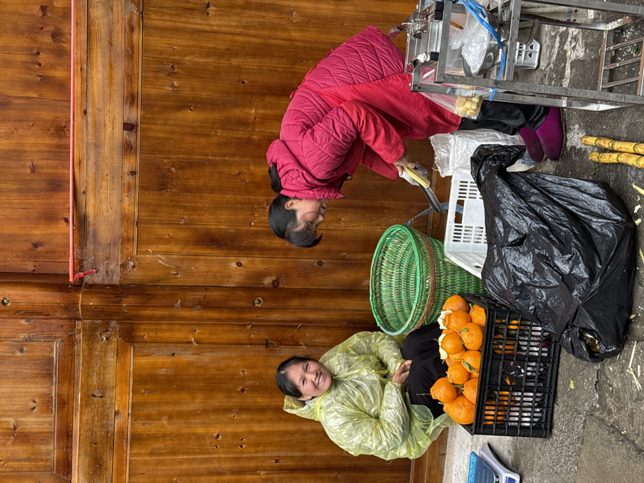 The scene in Gongtan, China, depicts two women engaged in street vending against a weathered wooden wall. On the left, a woman in a transparent lime-green raincoat and dark pants crouches on the damp ground, smiling directly at the viewer. Beside her, a black plastic crate is filled with numerous orange citrus fruits, some still bearing green leaves. A blue and white digital scale rests on the ground nearby. To the right, a second woman, dressed in a bright red quilted jacket, dark pants, and purple slip-on shoes, bends forward. She is actively processing a piece of sugarcane using a tool with a yellow handle and a silver blade. Between the two individuals are a large green woven basket and an empty white plastic crate. A crumpled black plastic bag lies on the wet pavement. To the far right, a multi-tiered stainless steel cart holds small plastic bags containing light-yellow peeled fruit segments and a metal bowl with clear ice or solids. Two segments of peeled sugarcane are visible on the ground in the immediate foreground. The background consists of a tall, light-brown wooden wall made of vertical planks, marked with a horizontal red pipe or bar at mid-height. The ground is a wet, dark-grey paved surface with scattered debris.