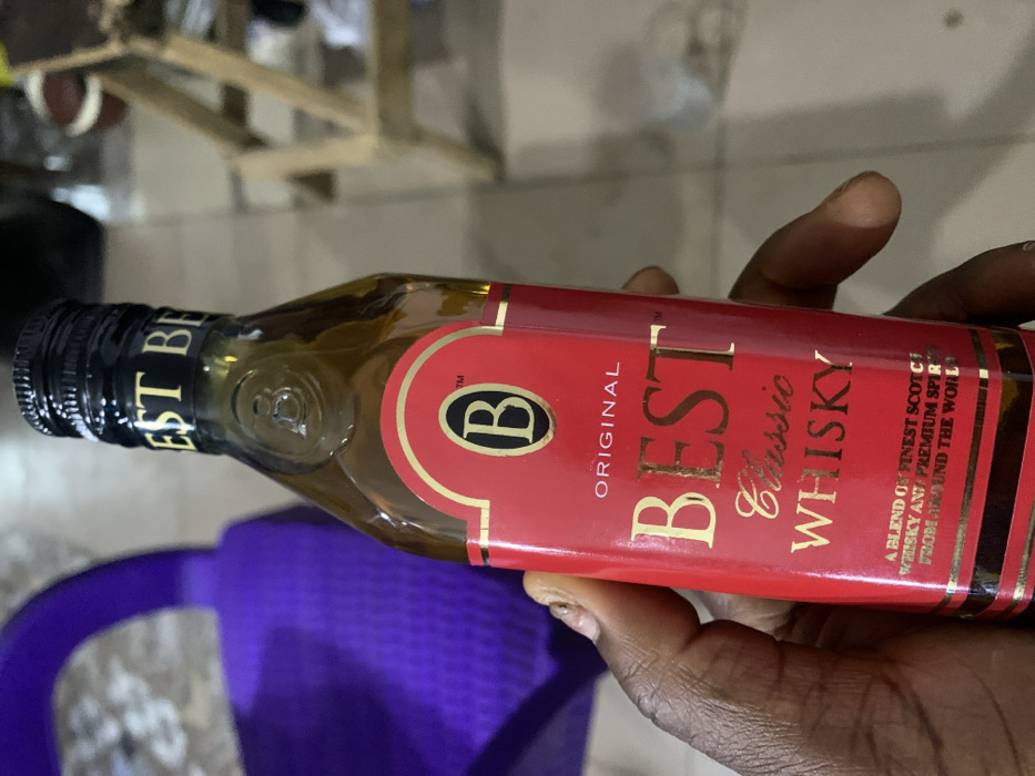 The image displays a dark-skinned hand holding a clear, rectangular glass bottle of "BEST Classic WHISKY